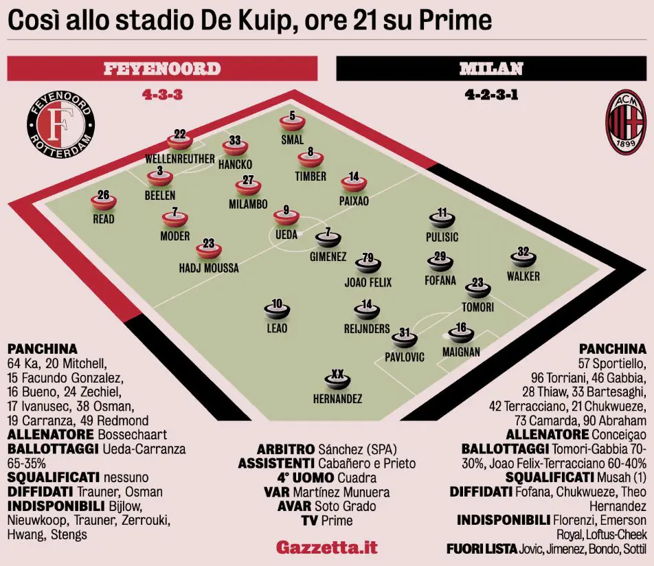 - Milan harus memanfaatkan kelemahan Feyenoord di lini belakang, terutama dengan absennya bek utama seperti Trauner.